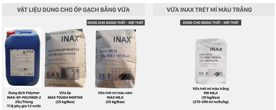 - Dung dịch Polymer (INAX-SP-POLYMER-2): Tăng cường độ bám dính (Tỉ lệ pha 1:2 nước).