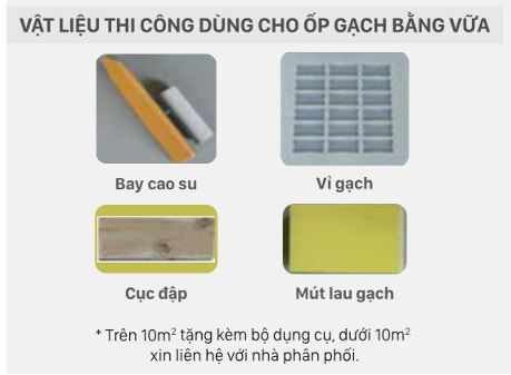 - Dụng cụ: Bay răng lược, búa cao su/cục đập, mút lau, khuôn nhựa (đối với ốp vữa).