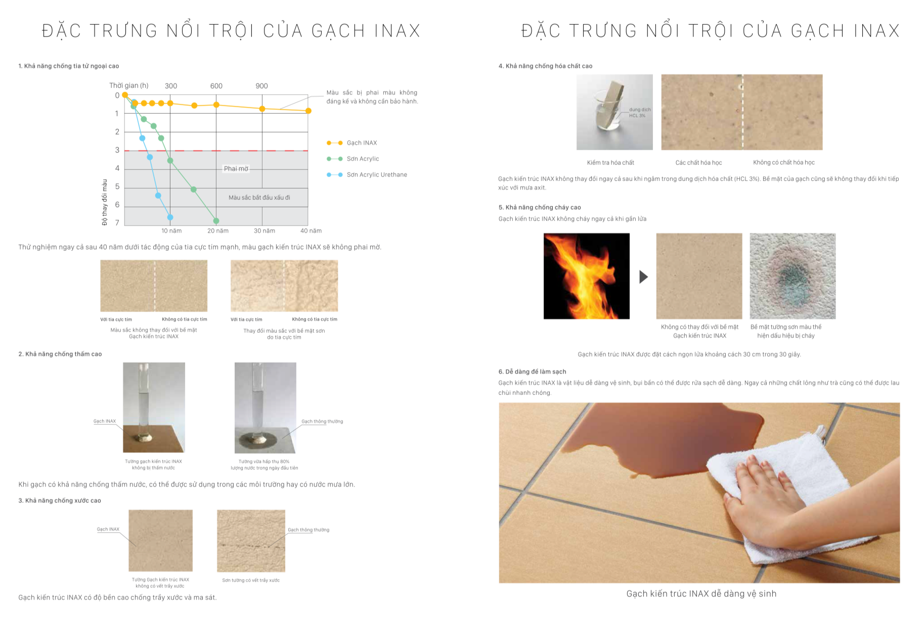 - Chống tia UV: Thử nghiệm tương đương 40 năm dưới tia cực tím mạnh cho thấy gạch hầu như không bị phai màu, trong khi sơn tường sẽ bị xuống cấp nhanh chóng.