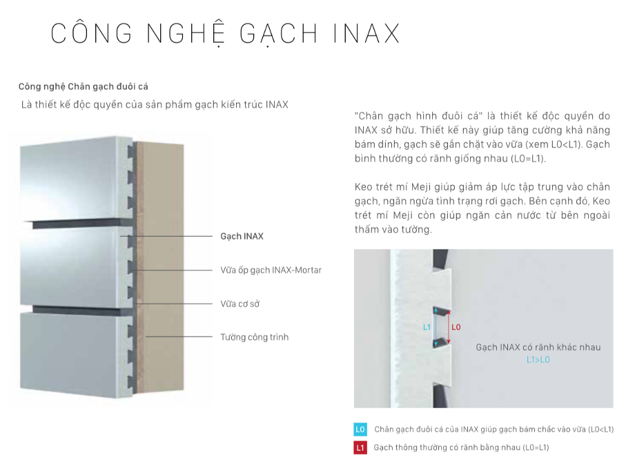 Sự an toàn là ưu tiên hàng đầu của người Nhật. Khác với gạch thông thường có mặt sau phẳng hoặc rãnh đều, gạch INAX sở hữu thiết kế chân gạch hình đuôi cá (Dovetail Back) độc quyền .